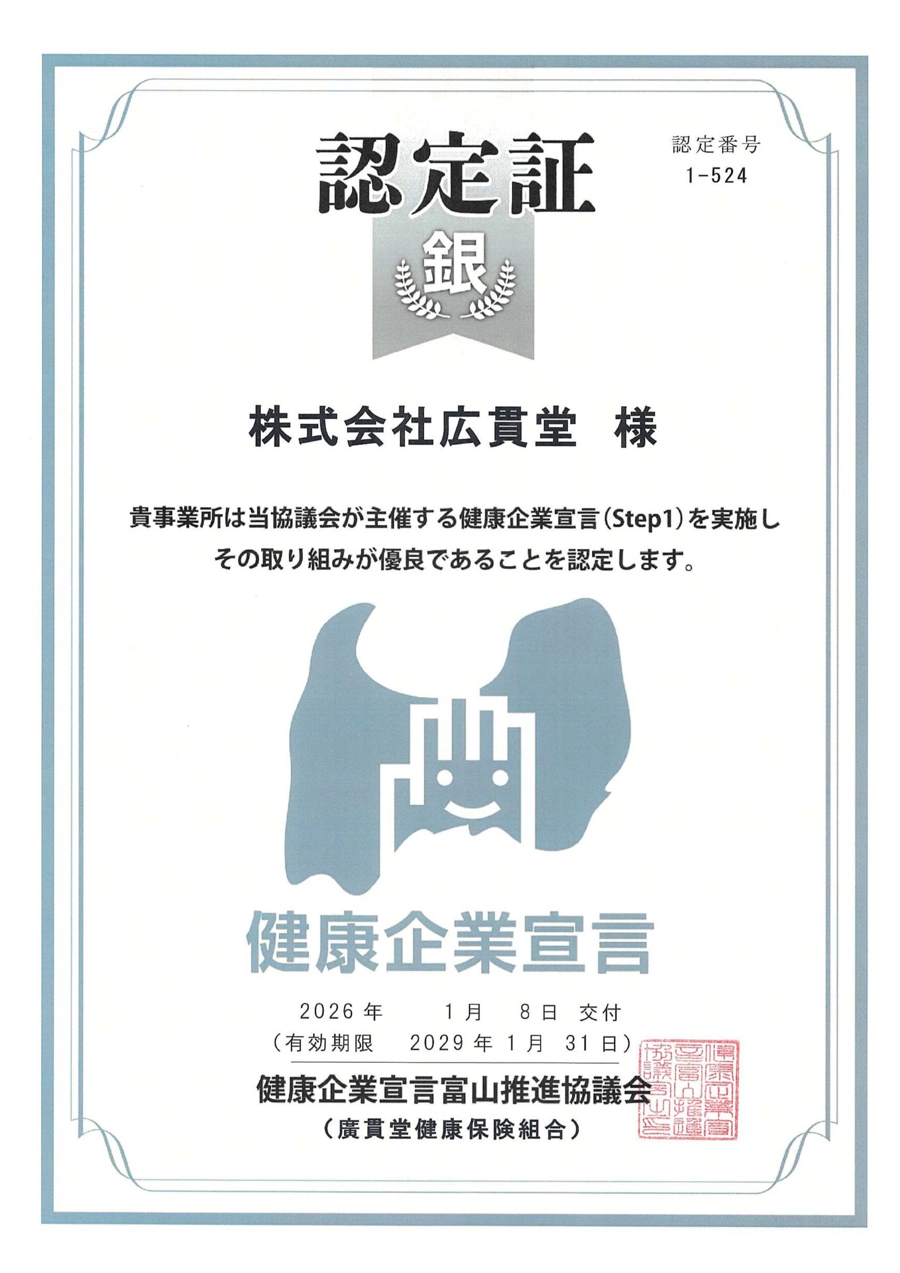 今般、その取り組みが優良であると評価され、「とやま健康企業宣言Step1」の認定を受けました。
